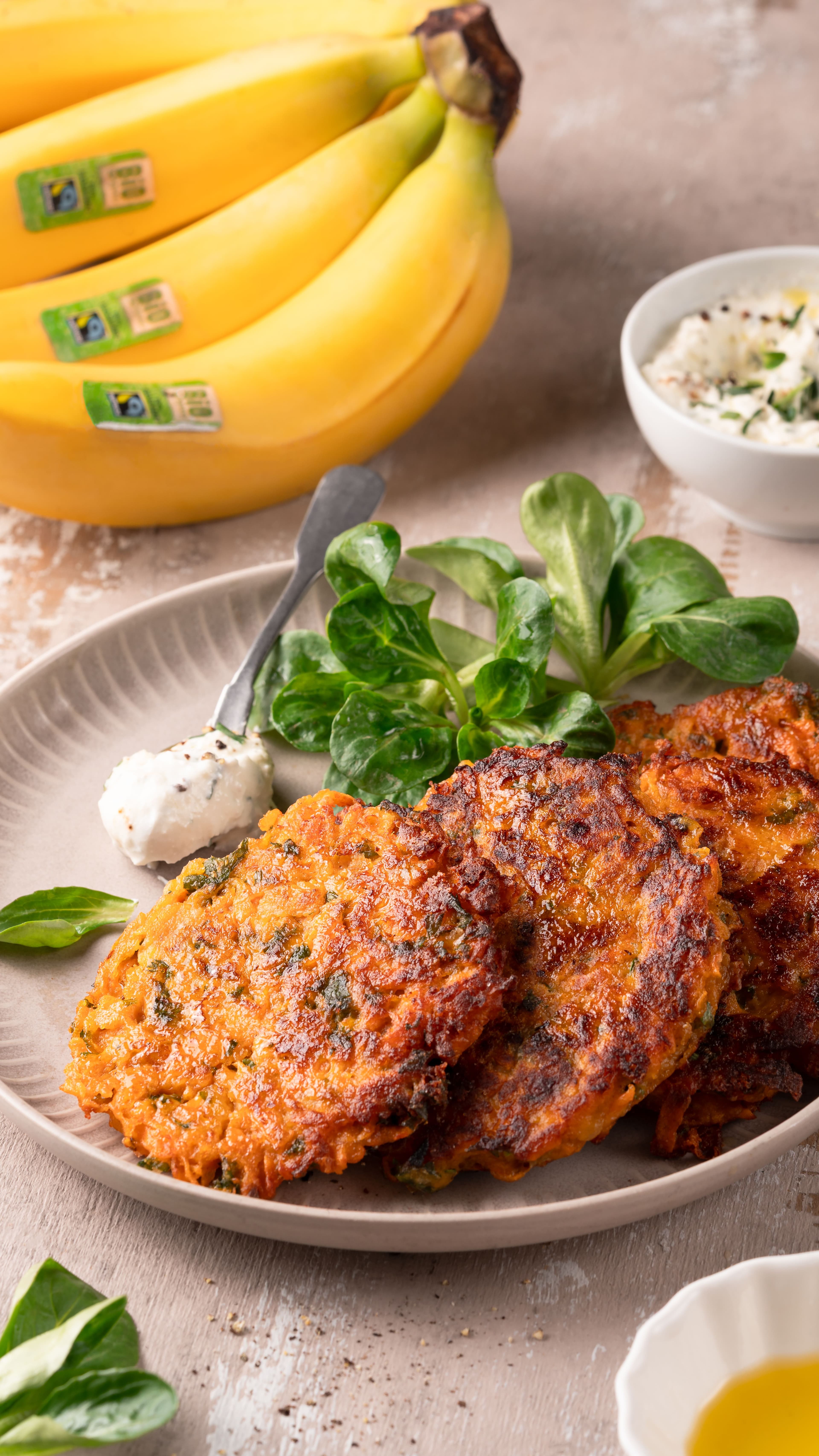 1. Épluchez et râpez la patate douce. Râpez le fromage. Épluchez et écrasez la banane. Hachez finement le persil.